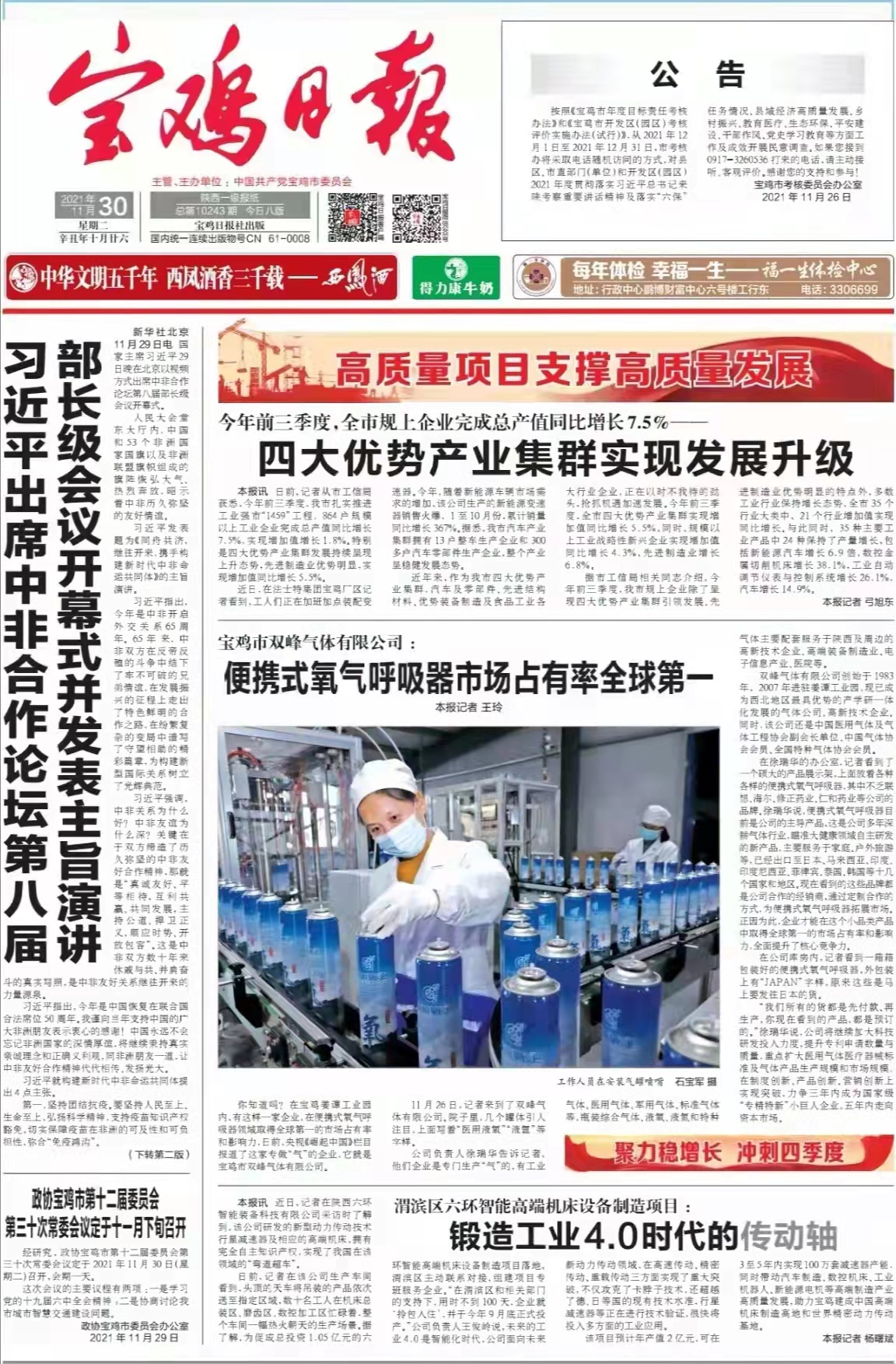 你知道嗎?在寶雞姜譚工業(yè)園內(nèi),有這樣一家企業(yè),在便攜式氧氣呼吸器領(lǐng)域取得全球第一的市場占有率和影響力,前段時(shí)間,央視《崛起中國》欄目專門報(bào)道這個(gè)專做“氣”的企業(yè),它就是寶雞市雙峰氣體有限公司。